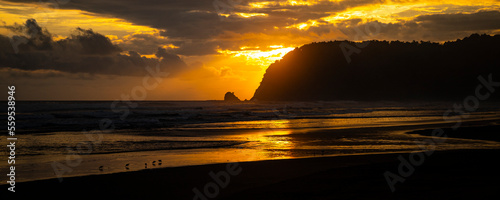 Obraz premium panorama of paradise Costa Rica beach at sunset; colorful sunset on tropical san miguel beach over the pacific
