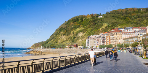 © venemama, Fototapeta premium Panorama of people walking the promenade at the Zurriola beach in San Sebastian, Spain