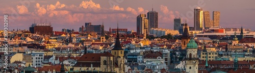 © Mike Mareen, Fototapeta premium Panorama of Prague architecture against the backdrop of beautiful storm clouds