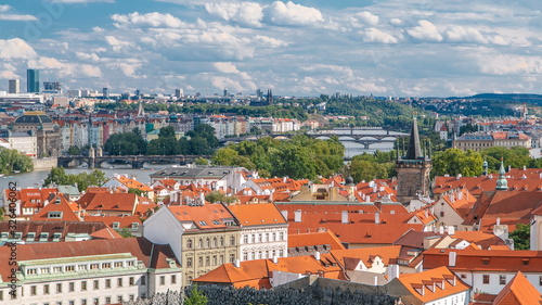 © HyperlapsePro, Fototapeta premium Panorama of Prague Old Town with red roofs timelapse, famous bridges and Vltava river, Czech Republic.