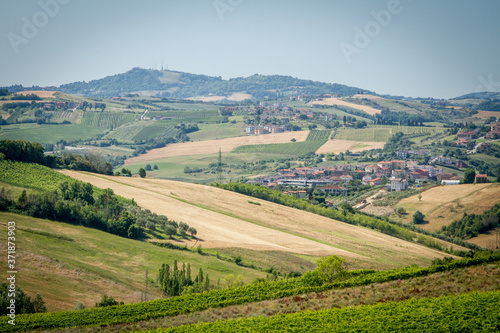 Naklejka premium Panorama of Republic of San Marino and Italy from Monte Titano, City of San Marino. City of San Marino is capital city of Republic of San Marino located on Italian peninsula, near Adriatic Sea.