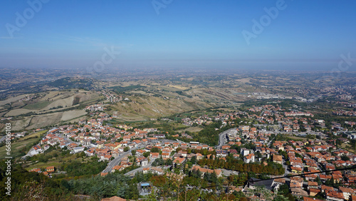 Fototapeta premium Panorama of Republic of San Marino and Italy from Monte Titano, City of San Marino. City of San Marino is capital city of Republic of San Marino located on Italian peninsula, near Adriatic Sea.