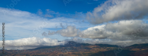Fototapeta premium Panorama of Rif mountain in Chefchaouen, Morocco. Beautiful scenery with cloudy sky in the mountains