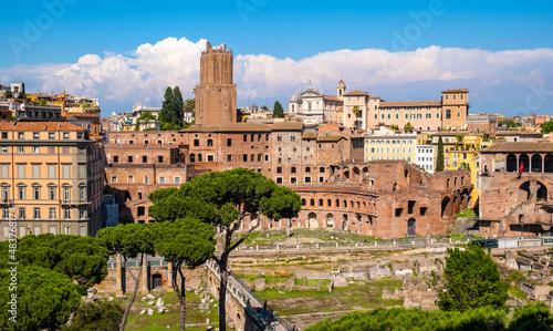 Obraz premium Panorama of Roman Forum Romanum with Forum of Caesar and Trajan's Market in historic center of Rome in Italy