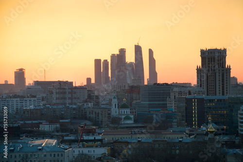 Obraz premium Panorama of roofs, domes of churches and skyscrapers during sunset in Moscow