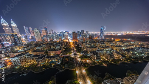 Fototapeta premium Panorama of skyscrapers in Barsha Heights district and low rise buildings in Greens district aerial night timelapse.