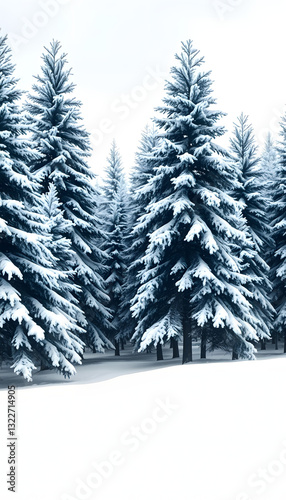 © Lola, Naklejka premium Panorama of spruce tree forest covered by fresh snow during Winter Christmas time. The winter scene is almost duotone due to contrast between the frosty spruce trees, white snow foreground and sky,