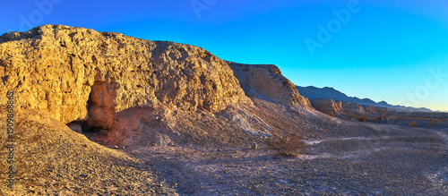 © Nicholas J. Klein, Obraz premium Panorama of Sunlit Fossil Bed Cliffs and Desert Plain at Golden Hour