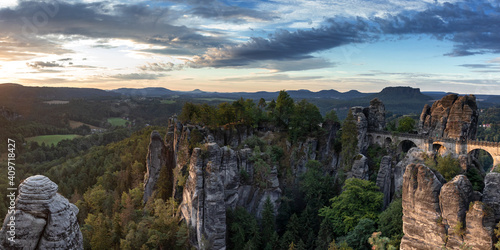 © Circumnavigation, Fototapeta premium Panorama of the Bastei bridge at the Bastei sandstone mountains