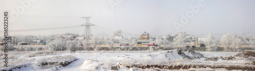 © Ivan, Obraz premium panorama of the city and power line with a view of the steppe in the morning in the fog