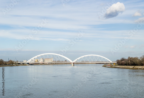 Fototapeta premium Panorama of the Danube river with a new bridge in Novi Sad, Serbia