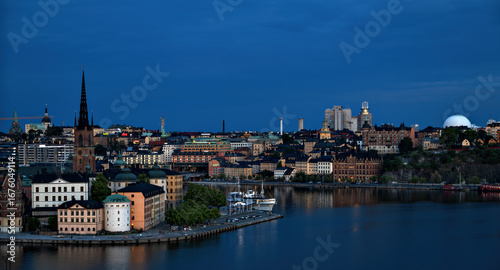 Naklejka premium Panorama of the districts Riddarholm and Södermalm at blue hour in Stockholm, Sweden