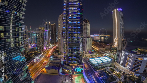 Obraz premium Panorama of the Dubai Marina and JBR area and the famous Ferris Wheel aerial day to night timelapse