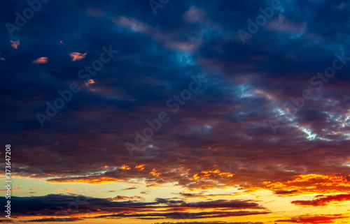 © Olegpodi, Obraz premium Panorama of the evening sky with dramatic orange, purple and dark blue clouds. Background image