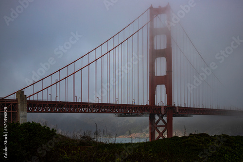 © Jakub, Naklejka premium panorama of the golden gate bridge in san francisco during foggy weather; the famous red bridge emerging from behind the clouds, gloomy photo of the golden gate bridge
