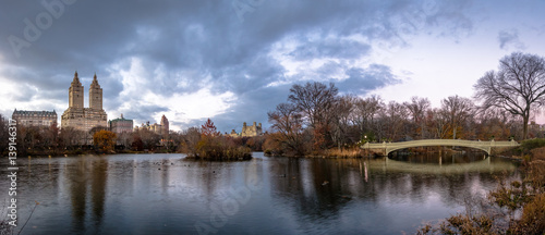 © diegograndi, Fototapeta premium Panorama of The Lake, Bow Bridge and buildings in Central Park - New York, USA