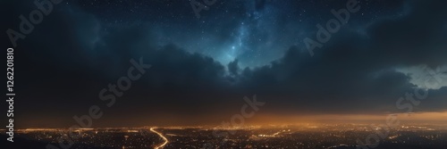 © Konstantin, Obraz premium panorama of the night city in the distance shines lights huge night sky with stars, beautiful night landscape, blog about traveling, flying, meditation, holidays, urban environment