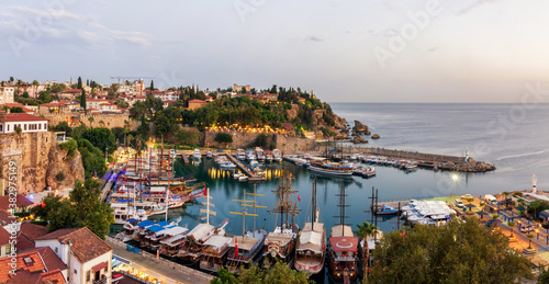Fototapeta premium Panorama of the old city in Antalya, the old port in the harbor are yachts and ships, evening illumination of the city