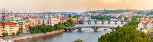 Obraz premium Panorama of the old part of Prague from the Letna park. Beautiful view on the bridges over the river Vltava at sunset. Old Town architecture, Czech Republic.