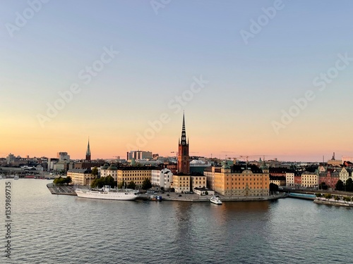 © Julija, Naklejka premium Panorama of the old town of Stockholm, Sweden. Cityscape of a historic district featuring a waterfront.