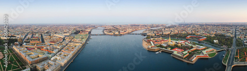 Obraz premium Panorama of the spit of Vasilyevsky island, Palace Square, the Hermitage, Peter and Paul Fortress and Petrograd Island.. Aerial view. The Neva river, St. Petersburg, Russia