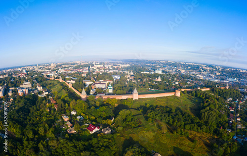 © miklyxa, Fototapeta premium Panorama of the western wall of the Smolensk Kremlin and the old part of the city of Smolensk from a flight height on a summer morning, Russia.