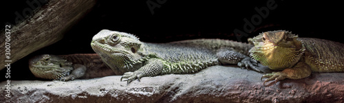 © Jon Anders Wiken, Obraz premium Panorama of three bearded dragons relaxing under the sun on a rock.