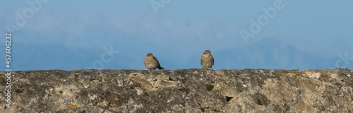 © ResiLente, Fototapeta premium Panorama of two sparrows on a stone wall on front of the 'Picos de Europa' mountain tange