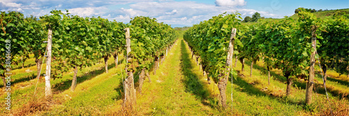 Naklejka premium Panorama of vine stocks in a vineyard
