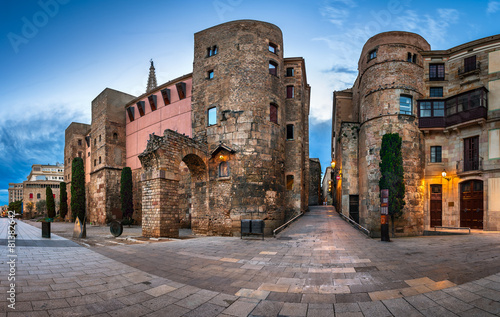 Obraz premium Panorama of Wall and Gate of Roman City Barcino and Placa Nova i