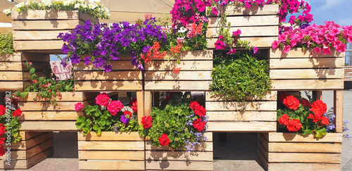 © Tanya, Fototapeta premium Panorama of wooden boxes in the form of flowerpots with petunia flowers.