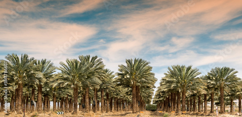 Naklejka premium Panorama. Plantations of date palms. Iconic ancient plant and healthy food crop. Currently it is sustainable agriculture industry in desert and arid areas of the Middle East. No AI tools were used