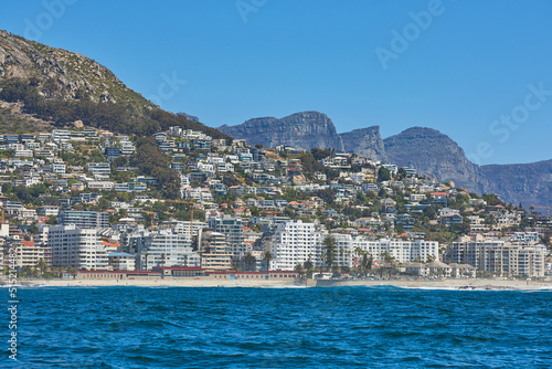 © SteenoWac/peopleimages.com, Fototapeta premium Panorama seascape with clouds, blue sky, and fancy hotel apartment buildings in the background. Sea Point with the Twelve Apostles and Table Mountain National Park in Cape Town, South Africa