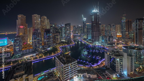 © HyperlapsePro, Obraz premium Panorama showing Dubai Marina skyscrapers and JBR district with luxury buildings and resorts aerial night timelapse