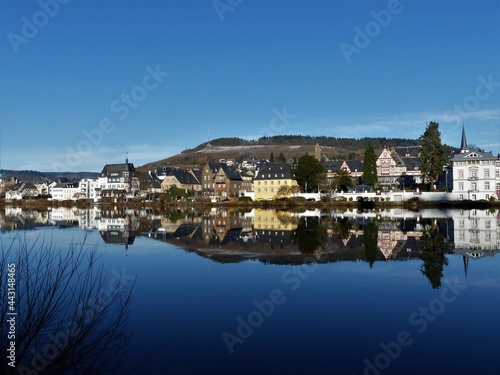 © SiRo, Fototapeta premium Panorama / Silhouette von Traben-Trarbach im Winter spiegelnd in der Mosel