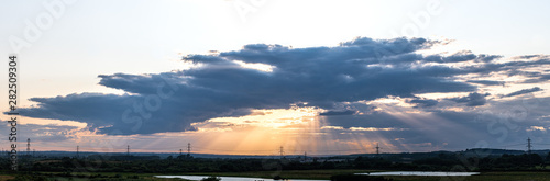 © Ian, Naklejka premium Panorama Sunset - Sun Hiding Behind Dark Clouds Creating God Rays