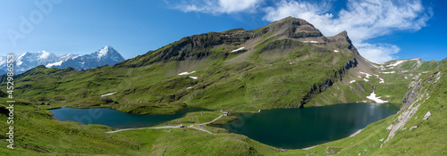 © Olivier Tabary, Fototapeta premium panorama sur deux lacs de montagne au milieu des prairies des alpes
