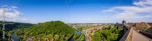 © Gerald Villena, Obraz premium Panorama sur le Doubs et Besançon depuis la Citadelle, fortifications au dessus de Besançon en France