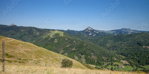 Fototapeta premium Panorama sur les montagnes d'Ardèche : le Gerbier de Joncs, le suc de Sara et...