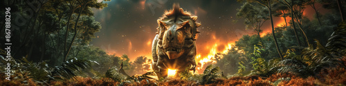Fototapeta premium panorama view, dinosaur in Jurassic, fantastic giant animal, monster and...