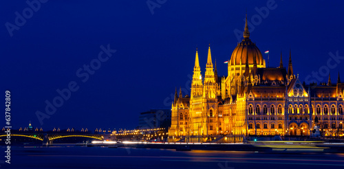 © SASITHORN, Fototapeta premium Panorama view in the night scene with building of Hungarian parliament at Danube river in Budapest city, Hungary.