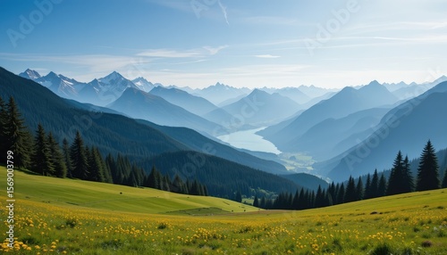 © NIAZ, Fototapeta premium Panorama view of alpine mountains with green meadows and cloudy sky in summer