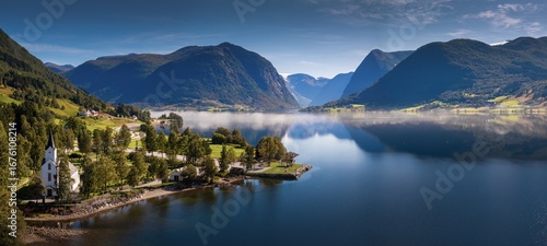 © makasana photo, Naklejka premium panorama view of Helgheim church and village in Vestland County of Norway