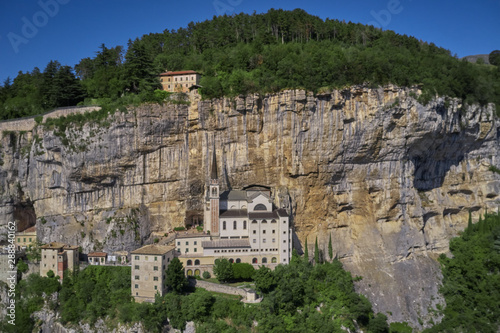 © Berg, Fototapeta premium Panorama view of Madonna della Corona, Italy. Flight by a drone. Popular travel destination in Nothern Italy.