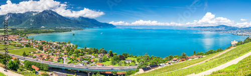Obraz premium Panorama view of Montreux city with Swiss Alps, lake Geneva and vineyard on...