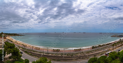 Naklejka premium Panorama view of Platja del Miracle beach and Balearic sea on the Dorada coast from Mediterranean Balcony in summer, Tarragona, Catalonia, Spain