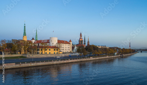 © Aleks Kend, Obraz premium Panorama view of Riga city and Daugava river.