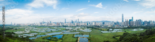 © lzf, Naklejka premium panorama view of rural green fields with fish ponds between Hong Kong and skylines of Shenzhen,China
