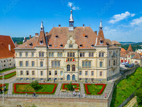 © dudlajzov, Fototapeta premium Panorama view of Sighisoara City Hall in Romania