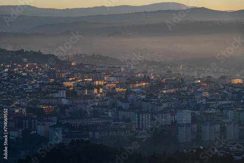 Obraz premium Panorama view of the skyline of the Galician city of Ourense at dusk as seen from the outskirts.